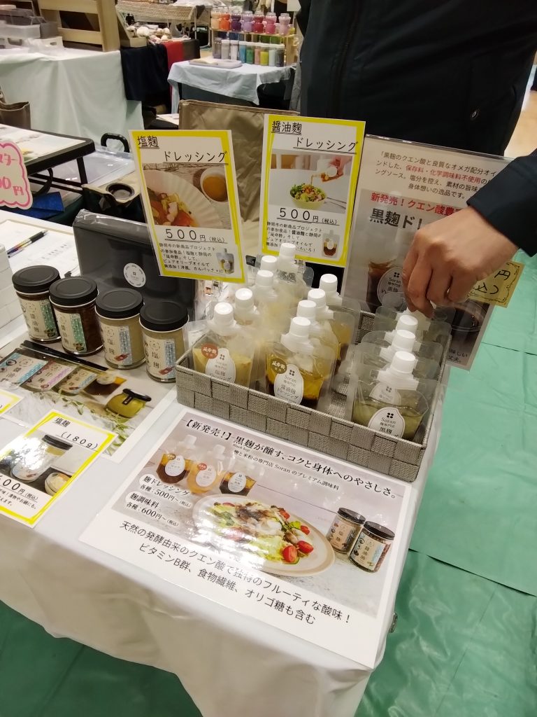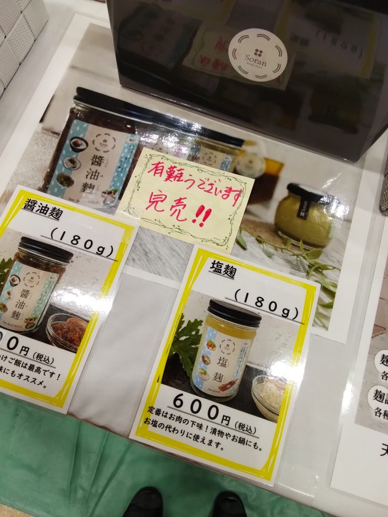 今回初めて販売した麹の商品。おかげ様で瓶入りの醤油麹は初日で完売しました。